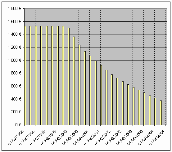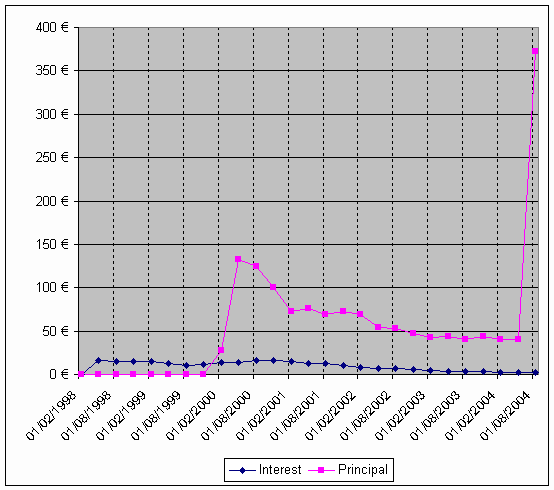 � � | Date | Outstanding balance | Interest | Principal | Payment | Currency | | 25/02/1998 | 10,000.00 | 0.00 | 0.00 | 0.00 | FRF | | 25/05/1998 | 10,000.00 | 108.50 | 0.00 | 108.50 | FRF | | 25/08/1998 | 10,000.00 | 96.18 | 0.00 | 96.18 | FRF | | 25/11/1998 | 10,000.00 | 94.78 | 0.00 | 94.78 | FRF | | 25/02/1999 | 10,000.00 | 96.18 | 0.00 | 96.18 | FRF | | 25/05/1999 | 10,000.00 | 80.32 | 0.00 | 80.32 | FRF | | 25/08/1999 | 10,000.00 | 70.25 | 0.00 | 70.25 | FRF | | 25/11/1999 | 10,000.00 | 72.98 | 0.00 | 72.98 | FRF | | 25/02/2000 | 9,820.07 | 92.40 | 179.93 | 272.33 | FRF | | 25/05/2000 | 8,948.08 | 93.33 | 871.99 | 965.32 | FRF | | 25/08/2000 | 8,129.80 | 105.60 | 818.28 | 923.88 | FRF | | 25/11/2000 | 7,475.30 | 106.86 | 654.50 | 761.36 | FRF | | 25/02/2001 | 6,999.24 | 99.03 | 476.06 | 575.09 | FRF | | 25/05/2001 | 6,501.12 | 85.15 | 498.12 | 583.27 | FRF | | 25/08/2001 | 6,045.20 | 80.27 | 455.92 | 536.19 | FRF | | 25/11/2001 | 848.63 | 10.43 | 72.95 | 83.38 | EUR | | 25/02/2002 | 778.97 | 7.60 | 69.66 | 77.26 | EUR | | 25/05/2002 | 724.61 | 6.94 | 54.36 | 61.30 | EUR | | 25/08/2002 | 671.15 | 6.69 | 53.46 | 60.15 | EUR | | 25/11/2002 | 623.88 | 6.00 | 47.27 | 53.27 | EUR | | 25/02/2003 | 580.66 | 5.12 | 43.22 | 48.34 | EUR | | 25/05/2003 | 536.80 | 4.00 | 43.86 | 47.86 | EUR | | 25/08/2003 | 496.94 | 3.41 | 39.86 | 43.27 | EUR | | 25/11/2003 | 453.58 | 2.94 | 43.36 | 46.30 | EUR | | 25/02/2004 | 412.92 | 2.68 | 40.66 | 43.34 | EUR | | 25/05/2004 | 372.23 | 2.31 | 40.69 | 43.00 | EUR | | 25/08/2004 | 0.00 | 2.15 | 372.23 | 374.38 | EUR | | Array created by LINCOLN | |