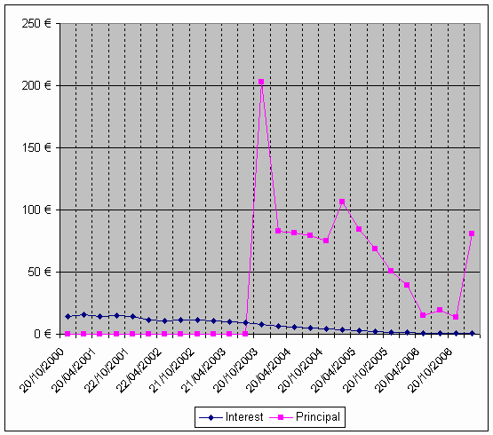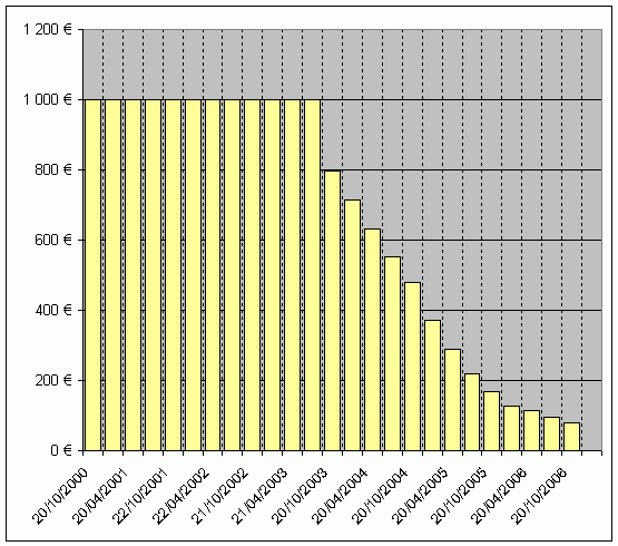 | Date | Outstanding balance | Interest | Principal | Payment | Currency | | 20/10/2000 | 6,559.57 | 93.80 | 0.00 | 93.80 | FRF | | 22/01/2001 | 6,559.57 | 103.55 | 0.00 | 103.55 | FRF | | 20/04/2001 | 6,559.57 | 93.12 | 0.00 | 93.12 | FRF | | 20/07/2001 | 6,559.57 | 96.31 | 0.00 | 96.31 | FRF | | 22/10/2001 | 6,559.57 | 94.42 | 0.00 | 94.42 | FRF | | 21/01/2002 | 1,000.00 | 11.78 | 0.00 | 11.78 | EUR | | 22/04/2002 | 1,000.00 | 11.05 | 0.00 | 11.05 | EUR | | 22/07/2002 | 1,000.00 | 11.18 | 0.00 | 11.18 | EUR | | 21/10/2002 | 1,000.00 | 11.21 | 0.00 | 11.21 | EUR | | 20/01/2003 | 1,000.00 | 10.97 | 0.00 | 10.97 | EUR | | 21/04/2003 | 1,000.00 | 9.85 | 0.00 | 9.85 | EUR | | 21/07/2003 | 1,000.00 | 8.97 | 0.00 | 8.97 | EUR | | 20/10/2003 | 797.18 | 7.98 | 202.82 | 210.80 | EUR | | 20/01/2004 | 714.05 | 6.45 | 83.13 | 89.58 | EUR | | 20/04/2004 | 632.68 | 5.60 | 81.37 | 86.97 | EUR | | 20/07/2004 | 553.12 | 4.93 | 79.56 | 84.49 | EUR | | 20/10/2004 | 478.47 | 4.44 | 74.65 | 79.09 | EUR | | 20/01/2005 | 371.70 | 3.88 | 106.77 | 110.65 | EUR | | 20/04/2005 | 287.33 | 2.94 | 84.37 | 87.31 | EUR | | 20/07/2005 | 218.42 | 2.29 | 68.91 | 71.20 | EUR | | 20/10/2005 | 167.39 | 1.75 | 51.03 | 52.78 | EUR | | 20/01/2006 | 128.01 | 1.37 | 39.38 | 40.75 | EUR | | | 20/04/2006 | 113.14 | 1.02 | 14.87 | 15.89 | EUR | | 20/07/2006 | 94.21 | 0.92 | 18.93 | 19.85 | EUR | | 20/10/2006 | 80.58 | 0.77 | 13.63 | 14.40 | EUR | | 22/01/2007 | 0.00 | 0.67 | 80.58 | 81.25 | EUR | | Array created by LINCOLN |