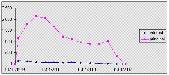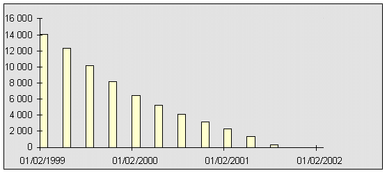 | Date | Outstanding balance | Interest | Principal | Payment | Currency | | 25/01/1999 | 100,000.00 | 0.00 | 0.00 | 0.00 | FRF | | 25/02/1999 | 92,487.87 | 881.28 | 7,512.13 | 8,393.41 | FRF | | 25/05/1999 | 80,773.91 | 742.88 | 11,713.96 | 12,456.84 | FRF | | 25/08/1999 | 66,776.53 | 567.45 | 13,997.38 | 14,564.83 | FRF | | 25/11/1999 | 53,300.20 | 487.37 | 13,476.33 | 13,963.70 | FRF | | 25/02/2000 | 42,360.64 | 492.54 | 10,939.56 | 11,432.10 | FRF | | 25/05/2000 | 34,354.33 | 402.63 | 8,006.31 | 8,408.94 | FRF | | 25/08/2000 | 27,053.77 | 405.43 | 7,300.56 | 7,705.99 | FRF | | 25/11/2000 | 20,755.67 | 355.60 | 6,298.10 | 6,653.70 | FRF | | 25/02/2001 | 14,807.29 | 274.97 | 5,948.38 | 6,223.35 | FRF | | 25/05/2001 | 8,855.30 | 180.14 | 5,951.99 | 6,132.13 | FRF | | 25/08/2001 | 331.72 | 16.66 | 1,018.26 | 1,034.92 | EUR | | 25/11/2001 | 0.00 | 3.75 | 331.72 | 335.47 | EUR | | 25/02/2002 | 0.00 | 0.00 | 0.00 | 0.00 | EUR | | 25/05/2002 | 0.00 | 0.00 | 0.00 | 0.00 | EUR | | 25/08/2002 | 0.00 | 0.00 | 0.00 | 0.00 | EUR | | 25/11/2002 | 0.00 | 0.00 | 0.00 | 0.00 | EUR | | 25/02/2003 | 0.00 | 0.00 | 0.00 | 0.00 | EUR | | 26/05/2003 | 0.00 | 0.00 | 0.00 | 0.00 | EUR | | 25/08/2003 | 0.00 | 0.00 | 0.00 | 0.00 | EUR | | 25/11/2003 | 0.00 | 0.00 | 0.00 | 0.00 | EUR | | 25/02/2004 | 0.00 | 0.00 | 0.00 | 0.00 | EUR | | 25/05/2004 | 0.00 | 0.00 | 0.00 | 0.00 | EUR | | 25/08/2004 | 0.00 | 0.00 | 0.00 | 0.00 | EUR | | 25/11/2004 | 0.00 | 0.00 | 0.00 | 0.00 | EUR | | 25/02/2005 | 0.00 | 0.00 | 0.00 | 0.00 | EUR | | 25/05/2005 | 0.00 | 0.00 | 0.00 | 0.00 | EUR | | 25/08/2005 | 0.00 | 0.00 | 0.00 | 0.00 | EUR | | 25/11/2005 | 0.00 | 0.00 | 0.00 | 0.00 | EUR | | 27/02/2006 | 0.00 | 0.00 | 0.00 | 0.00 | EUR | | 25/05/2006 | 0.00 | 0.00 | 0.00 | 0.00 | EUR | | Array created by LINCOLN |