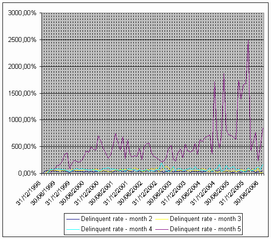 | Date | Senior share percentage | Outstanding payments ratio | Net loss ratio | Gross loss ratio | Subordinate share outstanding balance | Residual share interest | Senior share credit support | Subordinate share credit support | Currency | | 31/12/1998 | 0.00% | 0.00% | 0.00% | 0.00% | 925,000,000.00 | 0.00 | 10.00% | 0.51% | FRF | | 31/01/1999 | 90.75% | 0.11% | 0.00% | 0.00% | 907,673,917.50 | 0.00 | 10.00% | 0.52% | FRF | | 28/02/1999 | 90.75% | 0.11% | 0.00% | 0.00% | 907,673,917.50 | 0.00 | 10.16% | 0.53% | FRF | | 31/03/1999 | 90.75% | 0.11% | 0.00% | 0.00% | 907,673,917.50 | 0.00 | 10.39% | 0.54% | FRF | | 30/04/1999 | 90.56% | 0.43% | 0.01% | 0.01% | 880,703,230.00 | 14,078,797.20 | 10.76% | 0.99% | FRF | | 31/05/1999 | 90.56% | 0.43% | 0.01% | 0.01% | 880,703,230.00 | 14,078,797.20 | 11.01% | 1.01% | FRF | | 30/06/1999 | 90.56% | 0.43% | 0.01% | 0.01% | 880,703,230.00 | 14,078,797.20 | 11.32% | 1.04% | FRF | | 31/07/1999 | 90.23% | 0.90% | 0.01% | 0.01% | 853,950,935.00 | 49,230,526.34 | 11.78% | 1.50% | FRF | | 31/08/1999 | 90.23% | 0.90% | 0.01% | 0.01% | 853,950,935.00 | 49,230,526.34 | 12.11% | 1.54% | FRF | | 30/09/1999 | 90.23% | 0.90% | 0.01% | 0.01% | 853,950,935.00 | 49,230,526.34 | 12.48% | 1.59% | FRF | | 31/10/1999 | 89.72% | 1.42% | 0.02% | 0.02% | 827,316,022.50 | 42,032,064.44 | 12.39% | 1.54% | FRF | | 30/11/1999 | 89.72% | 1.42% | 0.02% | 0.02% | 827,316,022.50 | 42,032,064.44 | 12.73% | 1.58% | FRF | | 31/12/1999 | 89.72% | 1.42% | 0.02% | 0.02% | 827,316,022.50 | 42,032,064.44 | 13.06% | 1.62% | FRF | | 31/01/2000 | 89.14% | 1.20% | 0.03% | 0.03% | 800,596,565.00 | 49,791,909.23 | 13.11% | 1.77% | FRF | | 29/02/2000 | 89.14% | 1.20% | 0.03% | 0.03% | 800,596,565.00 | 49,791,909.23 | 13.39% | 1.81% | FRF | | 31/03/2000 | 89.14% | 1.20% | 0.03% | 0.03% | 800,596,565.00 | 49,791,909.23 | 13.69% | 1.85% | FRF | | 30/04/2000 | 88.66% | 0.77% | 0.05% | 0.05% | 774,036,855.00 | 37,300,972.62 | 13.35% | 1.69% | FRF | | 31/05/2000 | 88.66% | 0.77% | 0.05% | 0.05% | 774,036,855.00 | 37,300,972.62 | 13.61% | 1.72% | FRF | | 30/06/2000 | 88.66% | 0.77% | 0.05% | 0.05% | 774,036,855.00 | 37,300,972.62 | 13.88% | 1.76% | FRF | | 31/07/2000 | 88.34% | 0.88% | 0.06% | 0.07% | 747,717,737.50 | 33,788,616.26 | 13.69% | 1.74% | FRF | | 31/08/2000 | 88.34% | 0.88% | 0.06% | 0.07% | 747,717,737.50 | 33,788,616.26 | 13.95% | 1.77% | FRF | | 30/09/2000 | 88.34% | 0.88% | 0.06% | 0.07% | 747,717,737.50 | 33,788,616.26 | 14.20% | 1.80% | FRF | | 31/10/2000 | 88.05% | 0.97% | 0.07% | 0.09% | 721,765,197.50 | 30,410,429.48 | 13.96% | 1.78% | FRF | | 30/11/2000 | 88.05% | 0.97% | 0.07% | 0.09% | 721,765,197.50 | 30,410,429.48 | 14.22% | 1.81% | FRF | | 31/12/2000 | 88.05% | 0.97% | 0.07% | 0.09% | 721,765,197.50 | 30,410,429.48 | 14.48% | 1.85% | FRF | | 31/01/2001 | 87.81% | 1.00% | 0.09% | 0.12% | 696,282,002.50 | 29,625,131.46 | 14.28% | 1.87% | FRF | | 28/02/2001 | 87.81% | 1.00% | 0.09% | 0.12% | 696,282,002.50 | 29,625,131.46 | 14.56% | 1.90% | FRF | | 31/03/2001 | 87.81% | 1.00% | 0.09% | 0.12% | 696,282,002.50 | 29,625,131.46 | 14.83% | 1.94% | FRF | | 30/04/2001 | 87.58% | 0.92% | 0.10% | 0.14% | 671,384,517.50 | 30,769,029.60 | 14.68% | 2.00% | FRF | | 31/05/2001 | 87.58% | 0.92% | 0.10% | 0.14% | 671,384,517.50 | 30,769,029.60 | 15.00% | 2.04% | FRF | | 30/06/2001 | 87.58% | 0.92% | 0.10% | 0.14% | 671,384,517.50 | 30,769,029.60 | 15.33% | 2.09% | FRF | | 31/07/2001 | 87.31% | 0.86% | 0.11% | 0.16% | 98,622,297.50 | 3,753,299.18 | 15.45% | 2.36% | EUR | | 31/08/2001 | 87.31% | 0.86% | 0.11% | 0.16% | 98,622,297.50 | 3,753,299.18 | 15.42% | 2.06% | EUR | | 30/09/2001 | 87.31% | 0.86% | 0.11% | 0.16% | 98,622,297.50 | 3,753,299.18 | 15.73% | 2.10% | EUR | | 31/10/2001 | 86.91% | 0.94% | 0.15% | 0.21% | 94,886,407.50 | 3,095,099.54 | 15.47% | 2.05% | EUR | | 30/11/2001 | 86.91% | 0.94% | 0.15% | 0.21% | 94,886,407.50 | 3,095,099.54 | 15.79% | 2.10% | EUR | | 31/12/2001 | 86.91% | 0.94% | 0.15% | 0.21% | 94,886,407.50 | 3,095,099.54 | 16.13% | 2.14% | EUR | | 31/01/2002 | 86.59% | 0.94% | 0.18% | 0.24% | 91,279,740.00 | 3,120,621.77 | 15.94% | 2.19% | EUR | | 28/02/2002 | 86.59% | 0.94% | 0.18% | 0.24% | 91,279,740.00 | 3,120,621.77 | 16.29% | 2.24% | EUR | | 31/03/2002 | 86.59% | 0.94% | 0.18% | 0.24% | 91,279,740.00 | 3,120,621.77 | 16.66% | 2.29% | EUR | | 30/04/2002 | 86.25% | 0.87% | 0.20% | 0.27% | 87,747,997.50 | 2,744,326.79 | 16.39% | 2.28% | EUR | | 31/05/2002 | 86.25% | 0.87% | 0.20% | 0.27% | 87,747,997.50 | 2,744,326.79 | 16.77% | 2.33% | EUR | | 30/06/2002 | 86.25% | 0.87% | 0.20% | 0.27% | 87,747,997.50 | 2,744,326.79 | 17.16% | 2.39% | EUR | | 31/07/2002 | 85.89% | 0.86% | 0.20% | 0.28% | 84,347,975.00 | 2,883,913.90 | 17.06% | 2.48% | EUR | | 31/08/2002 | 85.89% | 0.86% | 0.20% | 0.28% | 84,347,975.00 | 2,883,913.90 | 17.48% | 2.54% | EUR | | 30/09/2002 | 85.89% | 0.86% | 0.20% | 0.28% | 84,347,975.00 | 2,883,913.90 | 17.86% | 2.59% | EUR | | 31/10/2002 | 85.41% | 0.90% | 0.22% | 0.32% | 80,983,842.50 | 2,405,694.93 | 17.54% | 2.56% | EUR | | 30/11/2002 | 85.41% | 0.90% | 0.22% | 0.32% | 80,983,842.50 | 2,405,694.93 | 17.95% | 2.62% | EUR | | 31/12/2002 | 85.41% | 0.90% | 0.22% | 0.32% | 80,983,842.50 | 2,405,694.93 | 18.36% | 2.68% | EUR | | 31/01/2003 | 85.02% | 0.90% | 0.20% | 0.33% | 77,753,187.50 | 2,728,504.82 | 18.14% | 2.76% | EUR | | 28/02/2003 | 85.02% | 0.90% | 0.20% | 0.33% | 77,753,187.50 | 2,728,504.82 | 18.61% | 2.87% | EUR | | 31/03/2003 | 85.02% | 0.90% | 0.20% | 0.33% | 77,753,187.50 | 2,728,504.82 | 19.04% | 2.93% | EUR | | 30/04/2003 | 84.62% | 0.94% | 0.21% | 0.35% | 74,615,495.00 | 2,246,970.60 | 18.69% | 2.90% | EUR | | 31/05/2003 | 84.62% | 0.94% | 0.21% | 0.35% | 74,615,495.00 | 2,246,970.60 | 19.15% | 2.97% | EUR | | 30/06/2003 | 84.62% | 0.94% | 0.21% | 0.35% | 74,615,495.00 | 2,246,970.60 | 19.66% | 3.05% | EUR | | 31/07/2003 | 84.20% | 0.97% | 0.20% | 0.36% | 71,557,352.50 | 2,177,073.71 | 19.47% | 3.08% | EUR | | 31/08/2003 | 84.20%