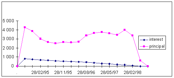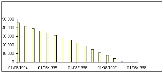 | Date | Outstanding balance | Interest | Principal | Payment | Currency | | . | 50,000.00 | 0.00 | 0.00 | 0.00 | FRF | | 28/08/1994 | 45,745.21 | 787.50 | 4,254.79 | 5,042.29 | FRF | | 28/11/1994 | 41,887.27 | 720.49 | 3,857.94 | 4,578.43 | FRF | | 28/02/1995 | 38,878.61 | 659.73 | 3,008.66 | 3,668.39 | FRF | | 28/05/1995 | 36,232.28 | 612.34 | 2,646.33 | 3,258.67 | FRF | | 28/08/1995 | 33,705.56 | 570.66 | 2,526.72 | 3,097.38 | FRF | | 28/11/1995 | 31,040.86 | 530.87 | 2,664.70 | 3,195.57 | FRF | | 28/02/1996 | 28,419.19 | 488.90 | 2,621.67 | 3,110.57 | FRF | | 28/05/1996 | 25,727.22 | 447.61 | 2,691.97 | 3,139.58 | FRF | | 28/08/1996 | 22,367.20 | 405.21 | 3,360.02 | 3,765.23 | FRF | | 28/11/1996 | 18,741.76 | 352.29 | 3,625.44 | 3,977.73 | FRF | | 28/02/1997 | 14,985.32 | 295.19 | 3,756.44 | 4,051.63 | FRF | | 28/05/1997 | 11,382.79 | 236.02 | 3,602.53 | 3,838.55 | FRF | | 28/08/1997 | 7,949.02 | 179.28 | 3,433.77 | 3,613.05 | FRF | | 28/11/1997 | 3,966.67 | 125.20 | 3,982.35 | 4,107.55 | FRF | | 28/02/1998 | 611.00 | 62.48 | 3,355.67 | 3,418.15 | FRF | | 28/05/1998 | 0.00 | 9.63 | 611.00 | 620.63 | FRF | | 28/08/1998 | 0.00 | 0.00 | 0.00 | 0.00 | FRF | | 28/11/1998 | 0.00 | 0.00 | 0.00 | 0.00 | FRF | | 28/02/1999 | 0.00 | 0.00 | 0.00 | 0.00 | FRF | | 28/05/1999 | 0.00 | 0.00 | 0.00 | 0.00 | FRF | | 28/08/1999 | 0.00 | 0.00 | 0.00 | 0.00 | FRF | | 28/11/1999 | 0.00 | 0.00 | 0.00 | 0.00 | FRF | | 28/02/2000 | 0.00 | 0.00 | 0.00 | 0.00 | FRF | | 28/05/2000 | 0.00 | 0.00 | 0.00 | 0.00 | FRF | | 28/08/2000 | 0.00 | 0.00 | 0.00 | 0.00 | FRF | | 28/11/2000 | 0.00 | 0.00 | 0.00 | 0.00 | FRF | | 28/02/2001 | 0.00 | 0.00 | 0.00 | 0.00 | FRF | | 28/05/2001 | 0.00 | 0.00 | 0.00 | 0.00 | FRF | | 28/08/2001 | 0.00 | 0.00 | 0.00 | 0.00 | FRF | | 28/11/2001 | 0.00 | 0.00 | 0.00 | 0.00 | FRF | | 28/02/2002 | 0.00 | 0.00 | 0.00 | 0.00 | FRF | | Array created by LINCOLN | |