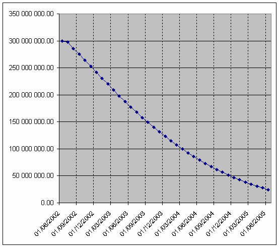 | Date | Outstanding balance | Prepayment amount | Prepayment rate (monthly basis) | Currency | | 30/06/2002 | 300,001,998.26 | 845,212.90 | 0.28% | EUR | | 31/07/2002 | 297,269,652.08 | 3,719,130.78 | 1.25% | EUR | | 31/08/2002 | 285,496,886.03 | 2,580,323.86 | 0.90% | EUR | | 30/09/2002 | 274,927,113.76 | 2,933,891.30 | 1.07% | EUR | | 31/10/2002 | 264,048,449.75 | 3,430,715.50 | 1.30% | EUR | | 30/11/2002 | 252,744,031.10 | 3,369,359.69 | 1.33% | EUR | | 31/12/2002 | 241,621,609.82 | 3,537,517.39 | 1.46% | EUR | | 31/01/2003 | 230,434,453.74 | 2,875,065.63 | 1.25% | EUR | | 28/02/2003 | 219,980,788.04 | 3,204,286.76 | 1.46% | EUR | | 31/03/2003 | 209,217,107.87 | 3,763,556.71 | 1.80% | EUR | | 30/04/2003 | 198,113,046.62 | 3,367,337.49 | 1.70% | EUR | | 31/05/2003 | 187,563,429.34 | 2,802,876.48 | 1.49% | EUR | | 30/06/2003 | 177,745,603.63 | 3,265,820.69 | 1.84% | EUR | | 31/07/2003 | 167,609,613.34 | 3,580,150.78 | 2.14% | EUR | | 31/08/2003 | 157,445,265.09 | 2,077,444.55 | 1.32% | EUR | | 30/09/2003 | 148,973,284.09 | 2,367,345.65 | 1.59% | EUR | | 31/10/2003 | 140,286,358.84 | 2,852,072.50 | 2.03% | EUR | | 30/11/2003 | 131,268,745.50 | 2,404,028.79 | 1.83% | EUR | | 31/12/2003 | 122,904,672.91 | 2,333,557.66 | 1.90% | EUR | | 31/01/2004 | 114,808,900.51 | 1,747,905.44 | 1.52% | EUR | | 29/02/2004 | 107,451,589.55 | 2,030,991.41 | 1.89% | EUR | | 31/03/2004 | 99,897,758.06 | 2,033,083.57 | 2.04% | EUR | | 30/04/2004 | 92,571,733.11 | 1,954,965.60 | 2.11% | EUR | | 31/05/2004 | 85,561,859.30 | 1,750,862.26 | 2.05% | EUR | | 30/06/2004 | 79,030,480.87 | 1,722,753.30 | 2.18% | EUR | | 31/07/2004 | 72,756,637.12 | 1,468,370.51 | 2.02% | EUR | | 31/08/2004 | 66,970,995.93 | 1,033,263.63 | 1.54% | EUR | | 30/09/2004 | 61,837,775.21 | 1,130,923.65 | 1.83% | EUR | | 31/10/2004 | 56,760,813.96 | 1,321,713.25 | 2.33% | EUR | | 30/11/2004 | 51,655,962.79 | 1,193,990.06 | 2.31% | EUR | | 31/12/2004 | 46,907,356.38 | 1,001,653.00 | 2.14% | EUR | | 31/01/2005 | 42,517,206.07 | 787,229.28 | 1.85% | EUR | | 28/02/2005 | 38,541,049.75 | 694,285.29 | 1.80% | EUR | | 31/03/2005 | 34,763,822.80 | 639,205.82 | 1.84% | EUR | | 30/04/2005 | 31,196,943.89 | 680,041.15 | 2.18% | EUR | | 31/05/2005 | 27,765,358.20 | 622,060.55 | 2.24% | EUR | | 30/06/2005 | 24,588,691.43 | 509,143.73 | 2.07% | EUR | | Array created by LINCOLN |