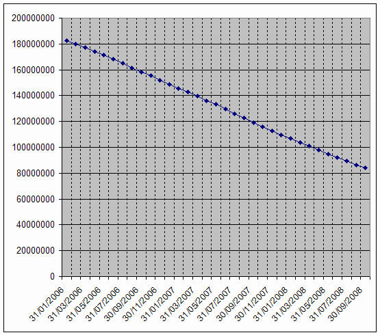 | Date | Outstanding balance | Prepayment amount | Prepayment rate (monthly basis) | Currency | | 31/01/2006 | 182 570 931,69 | 1 002 073,93 | 0,55% | EUR | | 28/02/2006 | 179 773 935,87 | 831 389,05 | 0,46% | EUR | | 31/03/2006 | 177 065 002,43 | 1 203 224,05 | 0,68% | EUR | | 30/04/2006 | 173 925 198,95 | 814 428,32 | 0,47% | EUR | | 31/05/2006 | 171 319 714,37 | 1 000 233,57 | 0,58% | EUR | | 30/06/2006 | 168 341 757,42 | 1 175 075,30 | 0,70% | EUR | | 31/07/2006 | 165 018 318,89 | 1 635 545,58 | 0,99% | EUR | | 31/08/2006 | 161 419 369,15 | 1 018 088,53 | 0,63% | EUR | | 30/09/2006 | 158 415 284,61 | 798 793,88 | 0,50% | EUR | | 31/10/2006 | 155 609 591,62 | 1 464 044,24 | 0,94% | EUR | | 30/11/2006 | 151 943 542,00 | 1 069 321,75 | 0,70% | EUR | | 31/12/2006 | 148 864 403,42 | 1 157 347,91 | 0,78% | EUR | | 31/01/2007 | 145 671 427,13 | 911 318,60 | 0,63% | EUR | | 28/02/2007 | 142 701 539,04 | 716 670,07 | 0,50% | EUR | | 31/03/2007 | 139 488 078,18 | 1 095 986,82 | 0,79% | EUR | | 30/04/2007 | 136 218 805,53 | 1 046 088,12 | 0,77% | EUR | | 31/05/2007 | 133 142 071,12 | 1 496 928,33 | 1,12% | EUR | | 30/06/2007 | 129 382 714,18 | 1 289 703,86 | 1,00% | EUR | | 31/07/2007 | 126 012 049,78 | 1 141 101,71 | 0,91% | EUR | | 31/08/2007 | 122 681 391,49 | 1 406 482,83 | 1,15% | EUR | | 30/09/2007 | 118 891 834,66 | 956 047,53 | 0,80% | EUR | | 31/10/2007 | 116 014 988,34 | 1 117 911,84 | 0,96% | EUR | | 30/11/2007 | 112 838 384,67 | 1 067 902,63 | 0,95% | EUR | | 31/12/2007 | 109 666 674,93 | 905 213,84 | 0,83% | EUR | | 31/01/2008 | 106 838 581,83 | 1 102 723,55 | 1,03% | EUR | | 29/02/2008 | 103 697 974,38 | 783 744,92 | 0,76% | EUR | | 31/03/2008 | 100 866 154,05 | 923 792,83 | 0,92% | EUR | | 30/04/2008 | 98 003 882,50 | 1 049 709,54 | 1,07% | EUR | | 31/05/2008 | 94 920 158,47 | 730 636,42 | 0,77% | EUR | | 30/06/2008 | 92 261 627,57 | 823 346,33 | 0,89% | EUR | | 31/07/2008 | 89 502 898,96 | 990 846,84 | 1,11% | EUR | | 31/08/2008 | 86 334 717,73 | 437 985,90 | 0,51% | EUR | | 30/09/2008 | 84 046 234,14 | 707 060,18 | 0,84% | EUR | | 31/10/2008 | 81 381 926,78 | 737 953,02 | 0,91% | EUR | | 30/11/2008 | 78 756 912,35 | 568 490,04 | 0,72% | EUR | | 31/12/2008 | 76 418 207,11 | 465 584,27 | 0,61% | EUR | | Array created by LINCOLN |